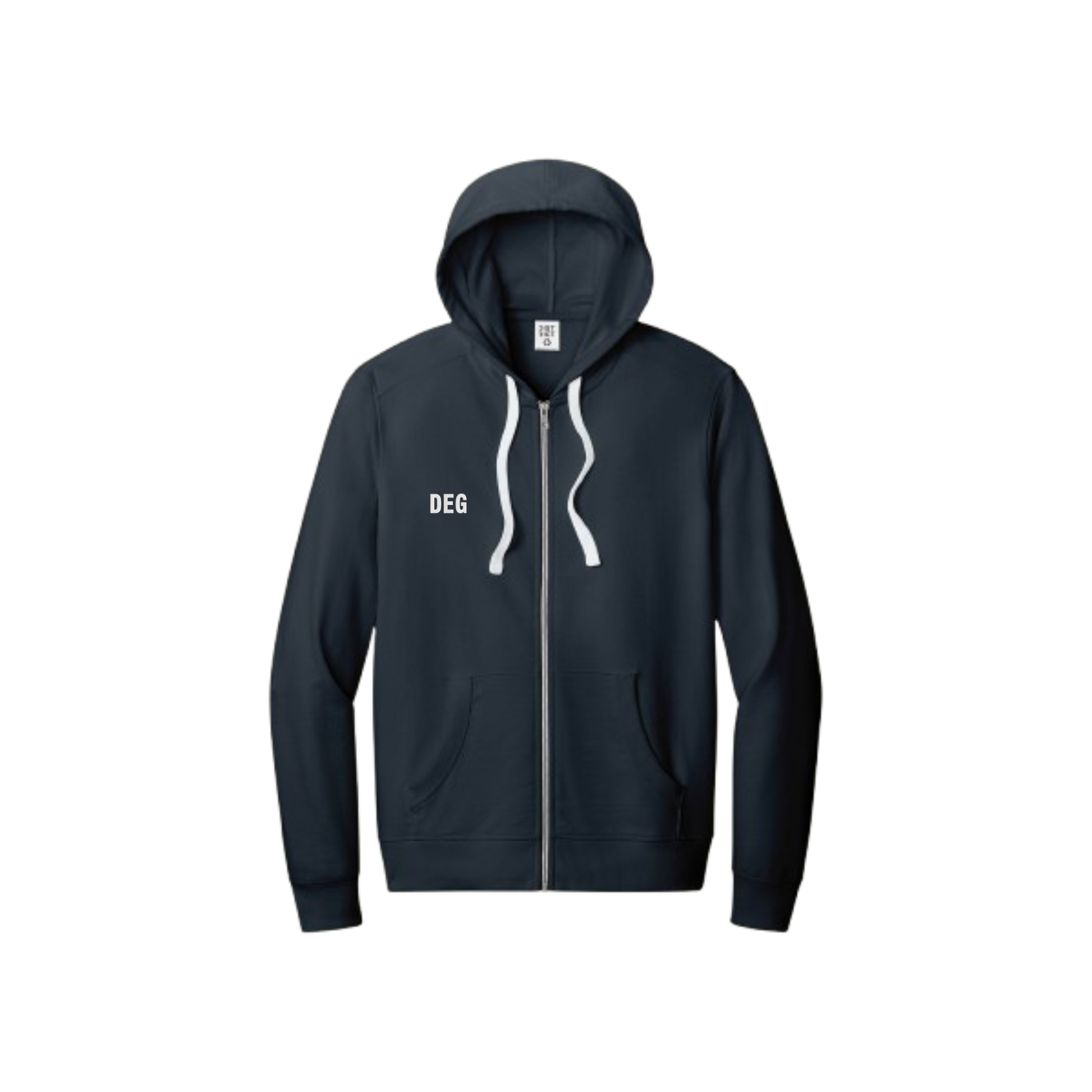 DEG ミニマル刺繍フルジップフーディー — メンズカジュアルジップアップスウェット